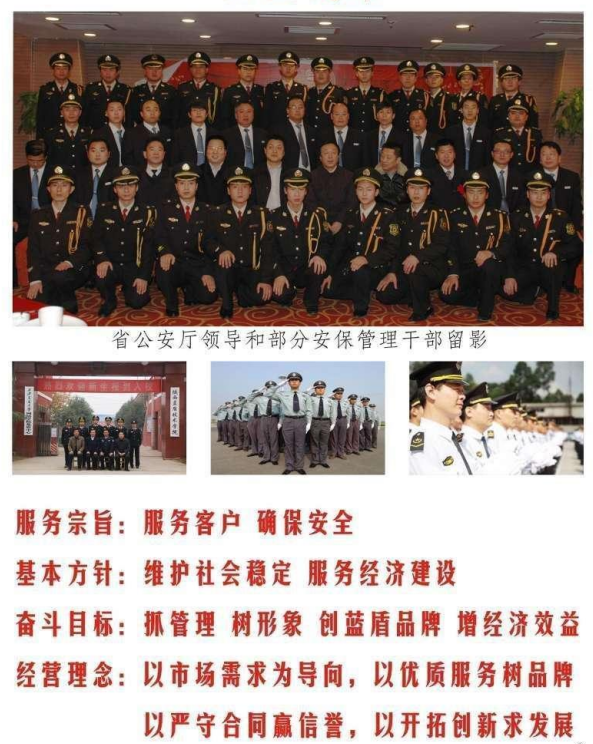 公司拥有一支经验丰富、技能过硬的保安队伍以及一整套完善的管理体系、管理团队和先进安保装备,具有《保安服务许可证》,取得了《质量、环境、职业健康管理体系证书》,经济和社会效益逐年提高。